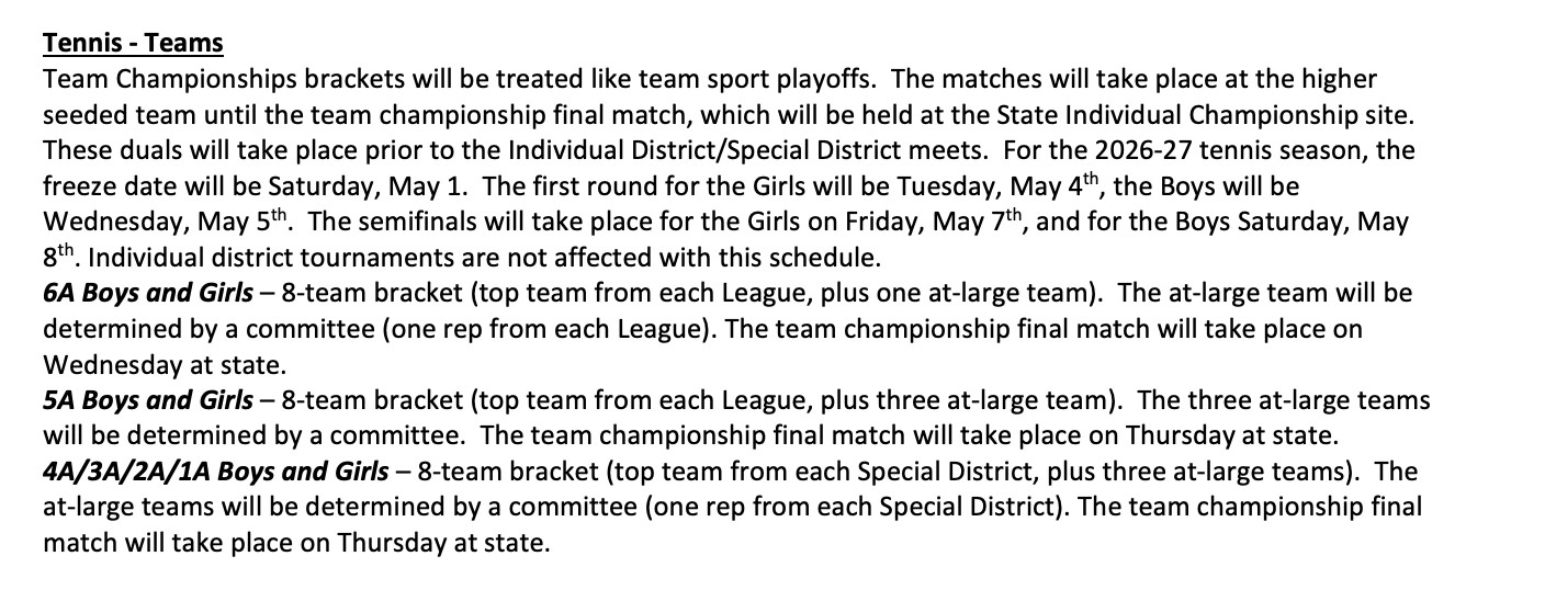 In our effort to propose this team tournament, we pointed out that only around 10% of students statewide qualify for state tournaments in tennis, versus over 40-60% in other sports like basketball, baseball, softball, and football. This massive inequity is further exacerbated by the fact that tennis teams often qualify more students from the same school, meaning that participation is further constrained.