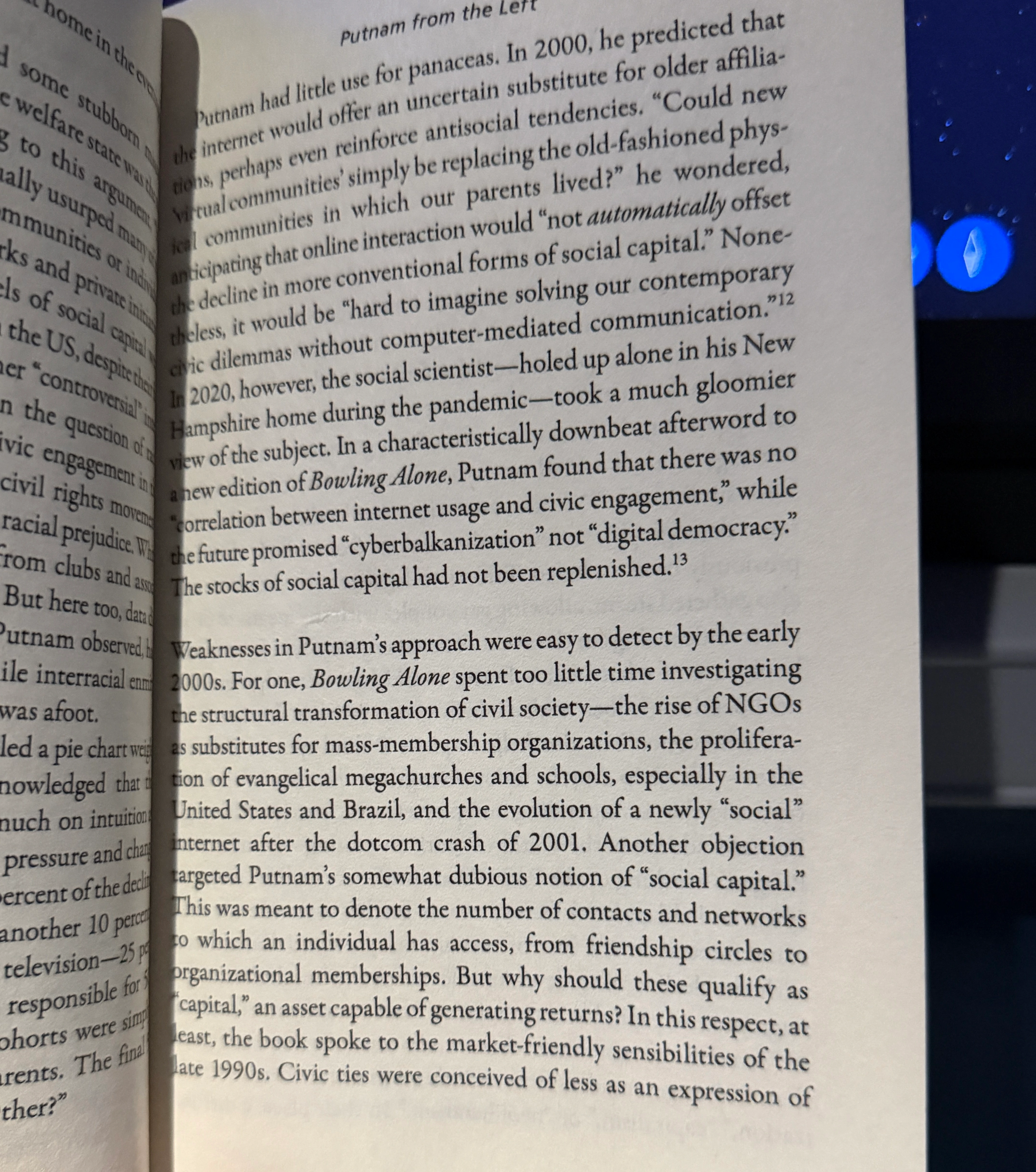 Was reading Anton Jager's Hyperpolitics on the plane recently and he has a chapter called Putnam From The Left, where he revisits Robert Putnam's 2000's era bestseller Bowling Alone, which if you haven't read it, is quite the temporal shift from today's absurdity-as-politics.